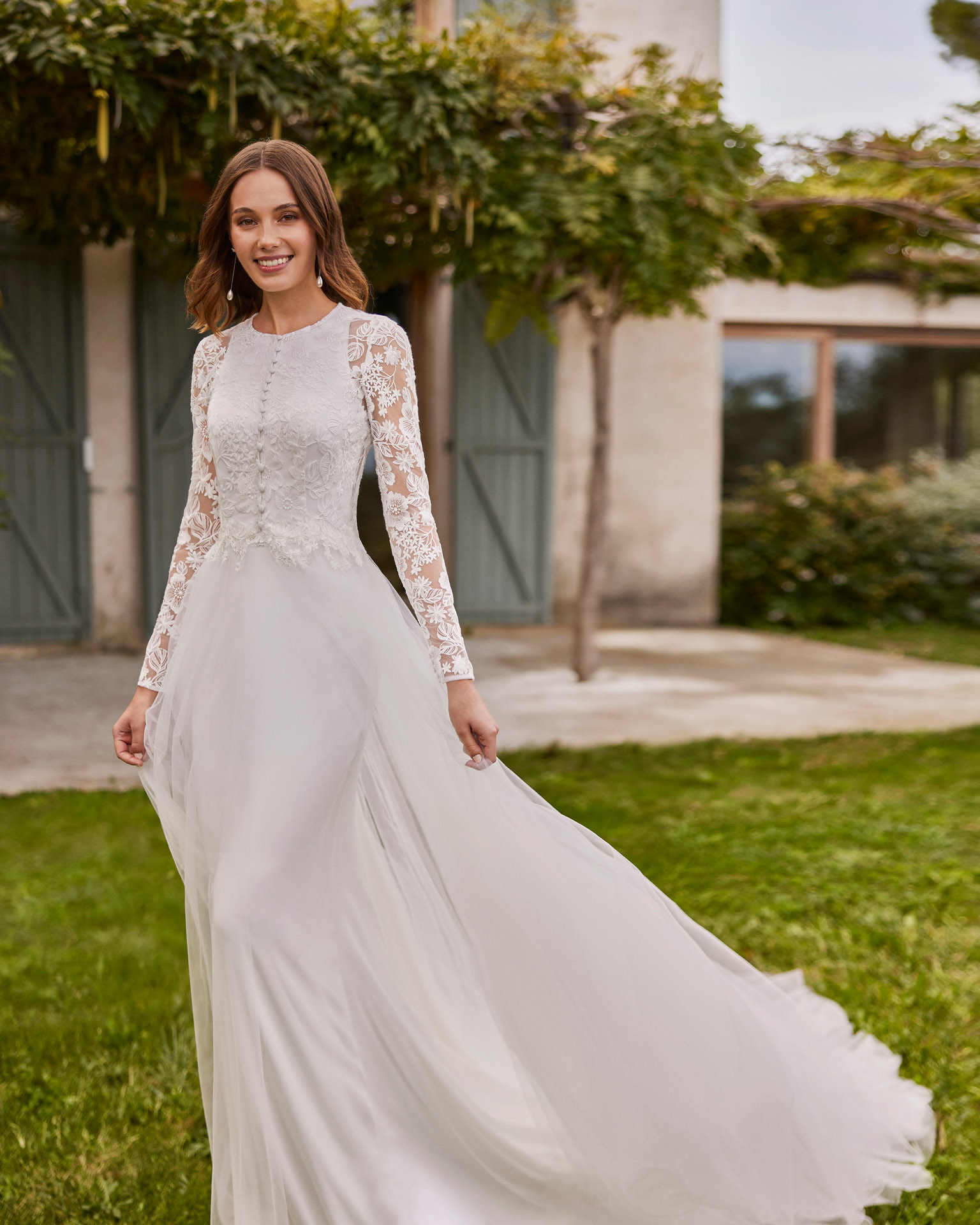 Vestido minimalista y juvenil en crepe y corte recto. Sin escote delantero, pero precioso escote trasero. Y para las novias de otoño, invierno, original abrigo en encaje y tul para acompañarlo.