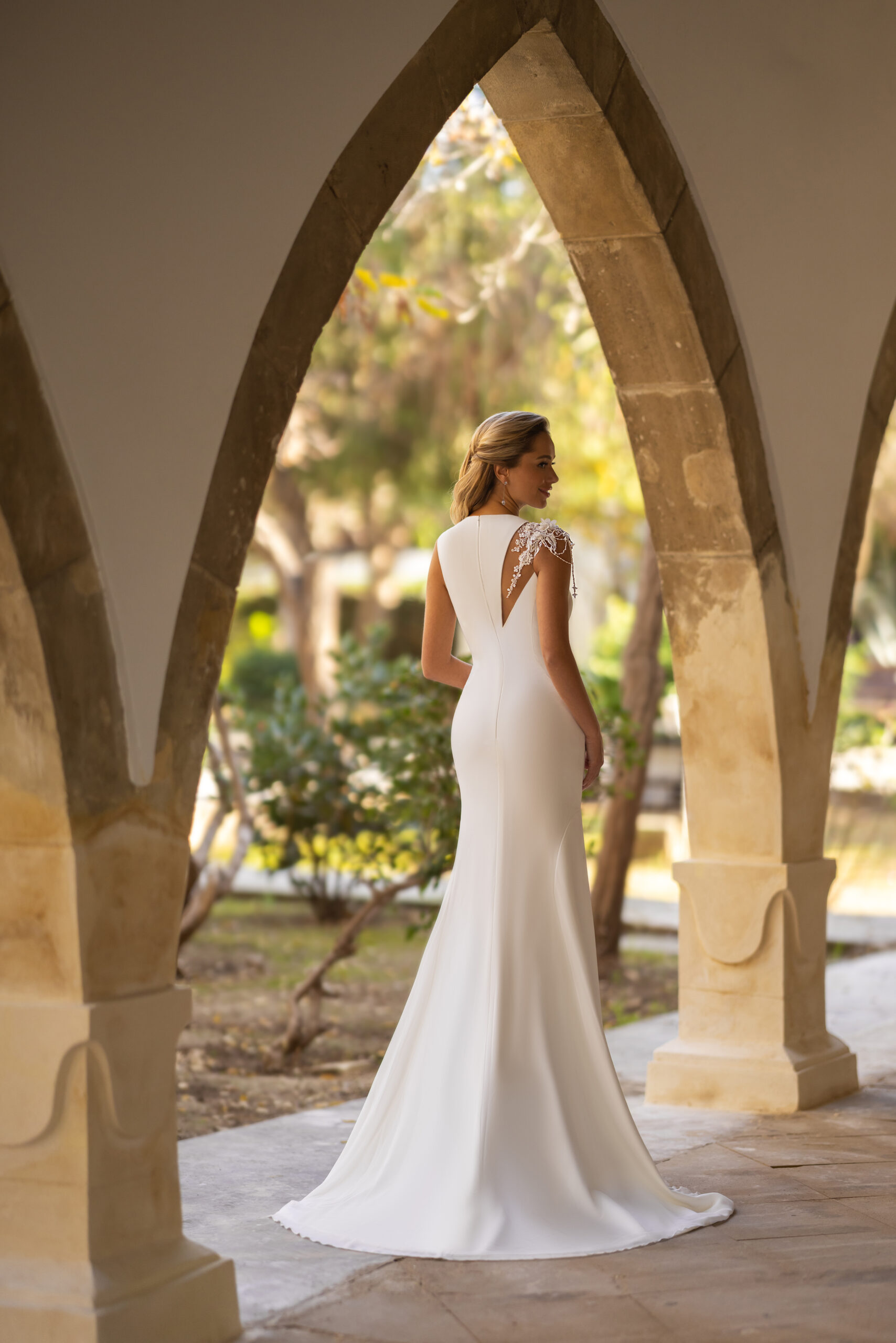Vestido sirena en crepe con escote cerrado y abertura lateral en el hombro con detalles de encaje. Original, diferente y femenino.