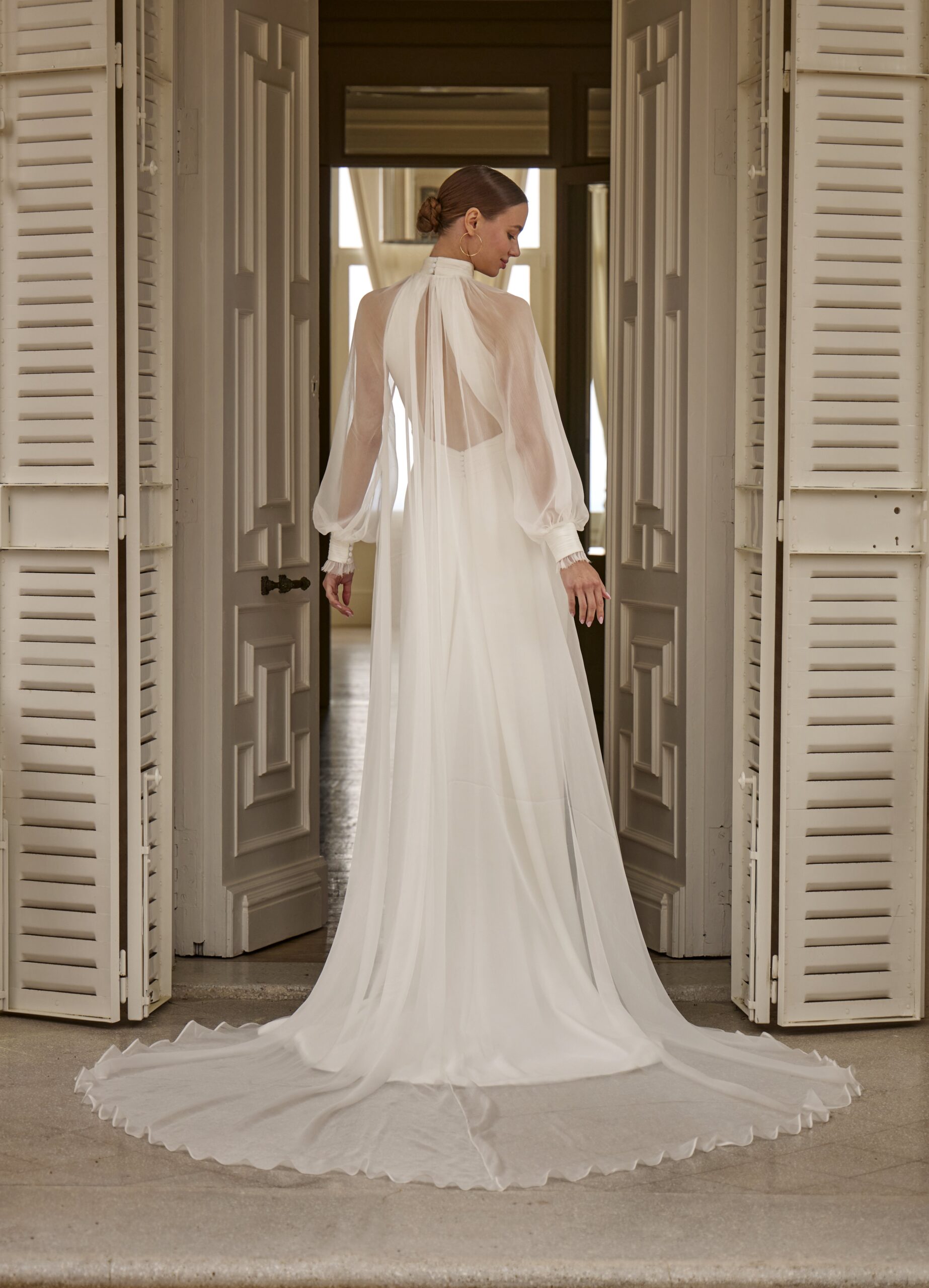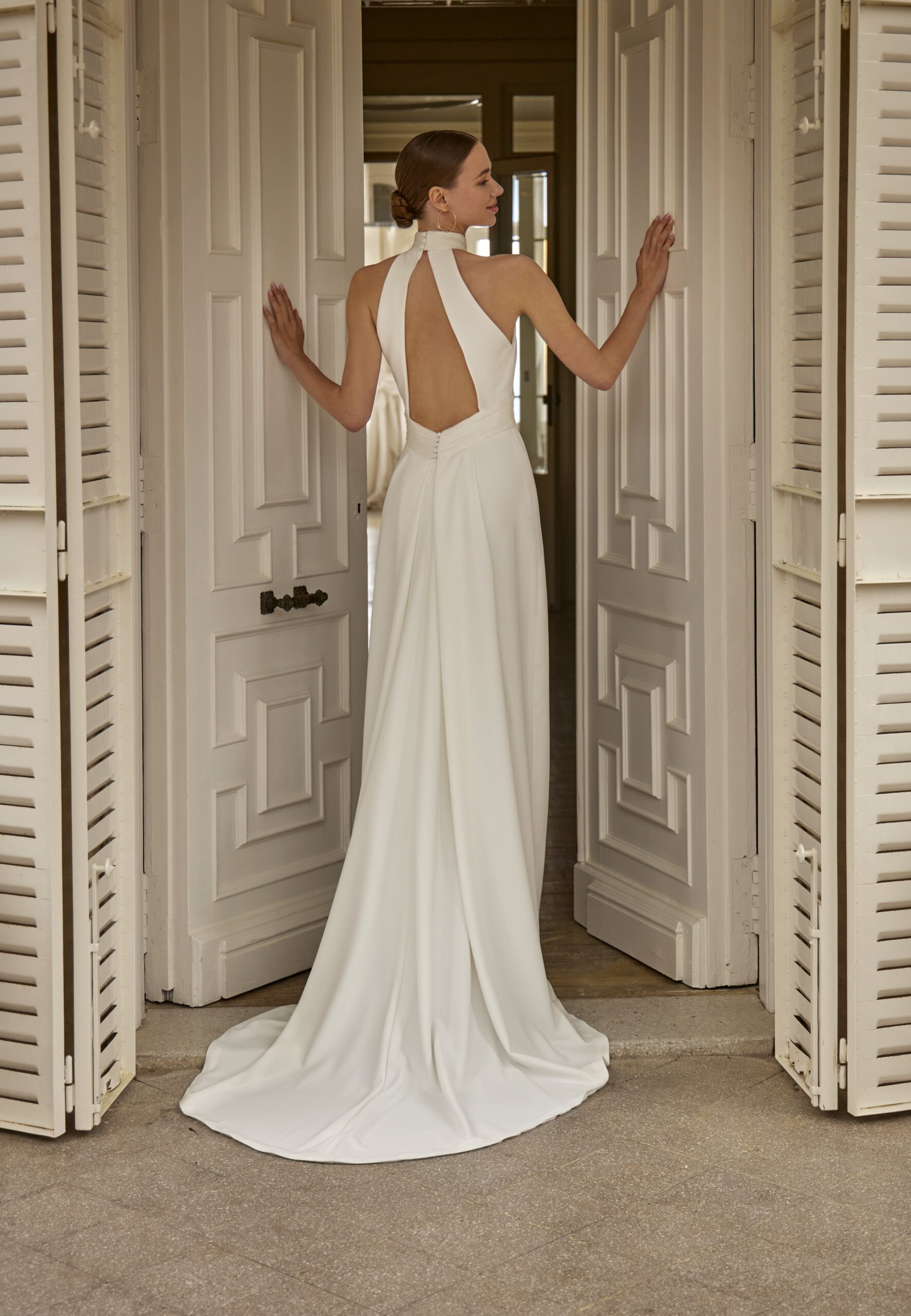 Vestido novia en crepe corte recto. Cuello halter y espalda baja descubierta. Trae un abrigo muy romántico con mangas para aquellas novias que quieren tapar el brazo.